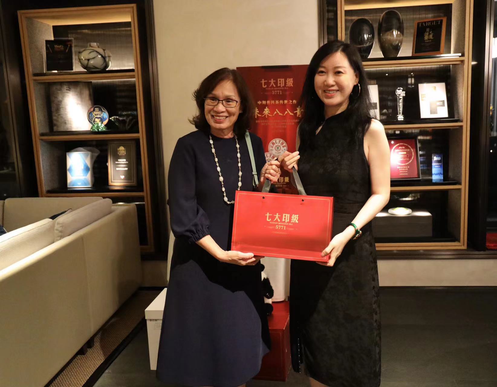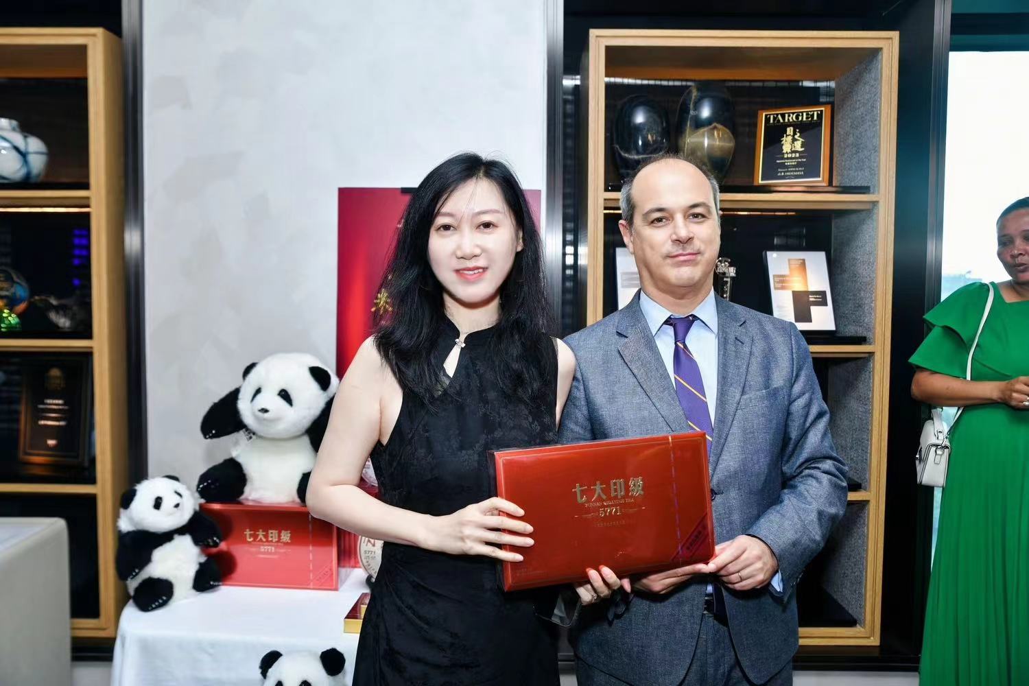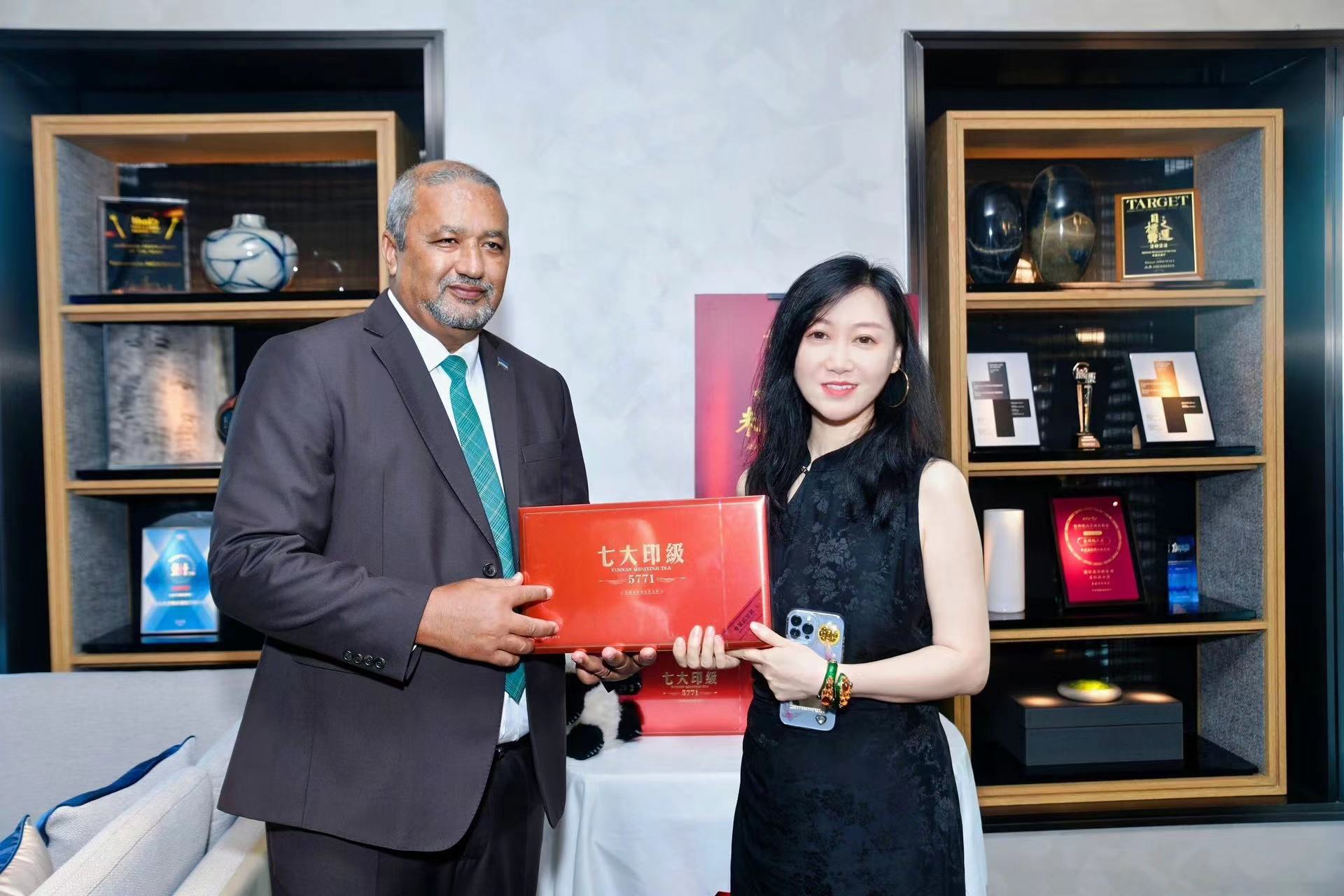 天月集团向加拿大驻华大使梅倩琳、苏里南驻华大使Pick Fung Ho-Chong 、马耳他驻华大使 白瀚轩赠送七大印级5771茶礼。