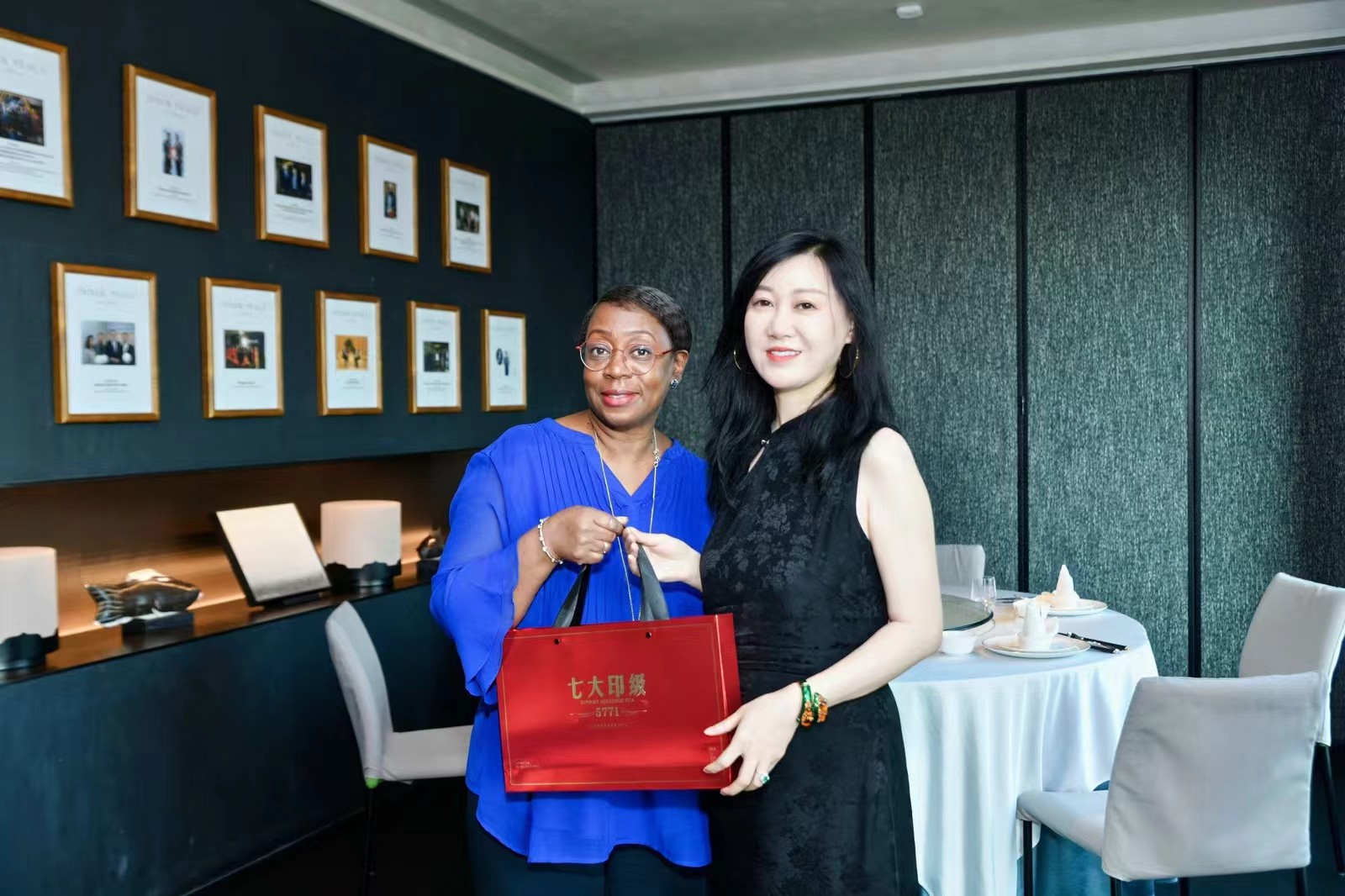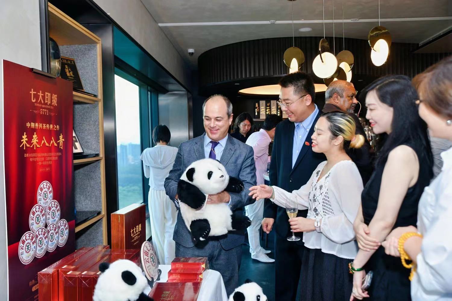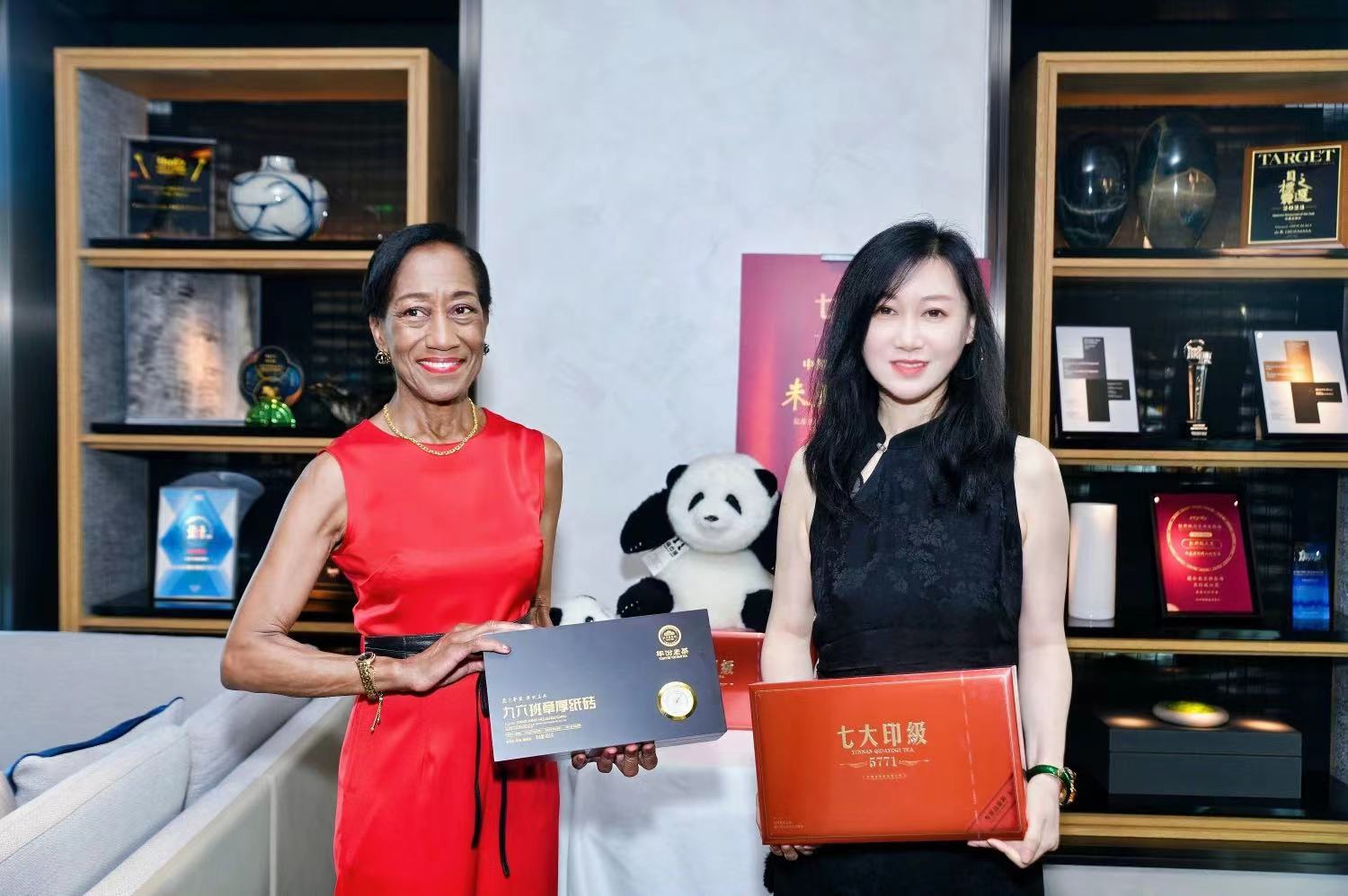 天月集团向加拿大驻华大使梅倩琳、苏里南驻华大使Pick Fung Ho-Chong 、马耳他驻华大使 白瀚轩赠送七大印级5771茶礼。