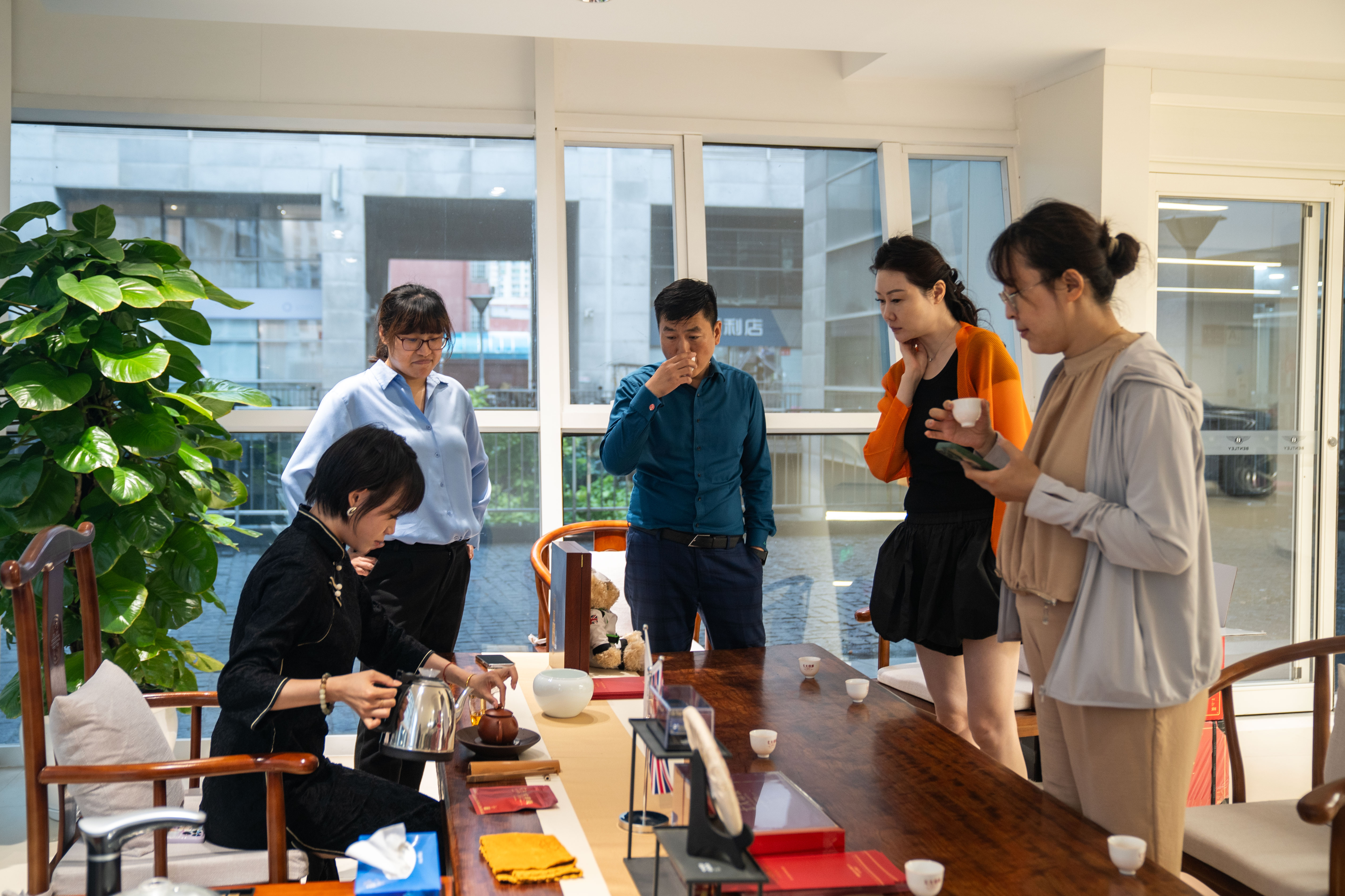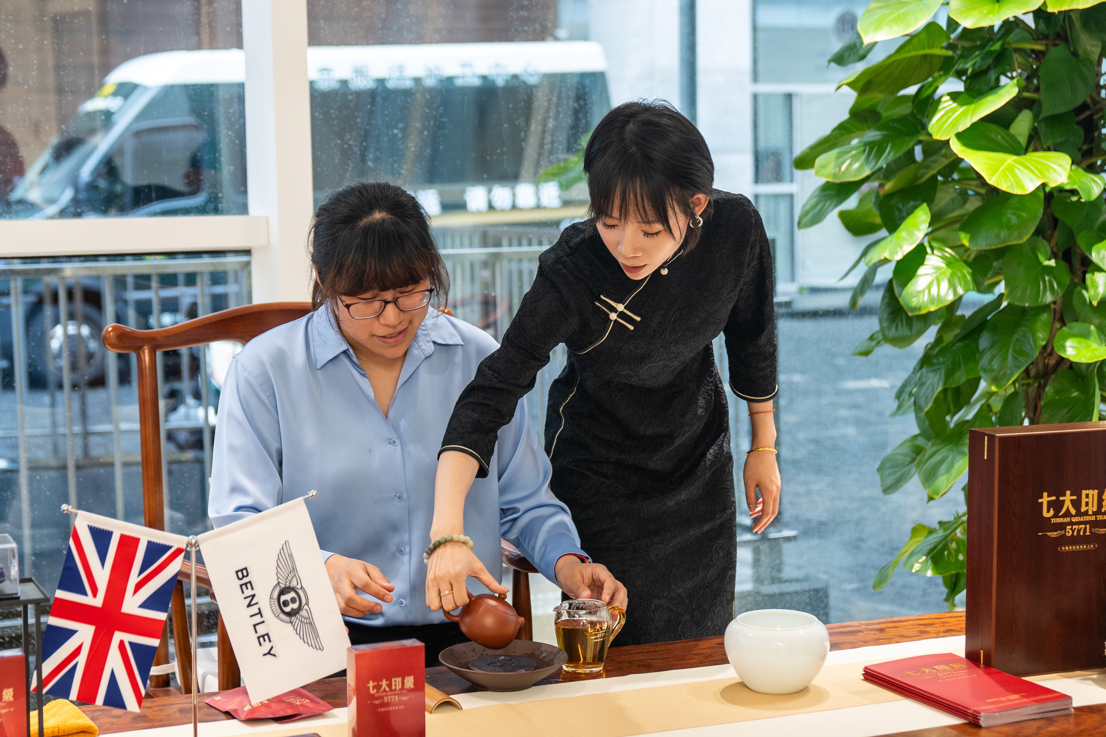 现场,茶艺师为北京宾利-三里屯展厅大客户销售们讲解七大印级5771历史以及冲泡技巧,并现场录制教学视频。