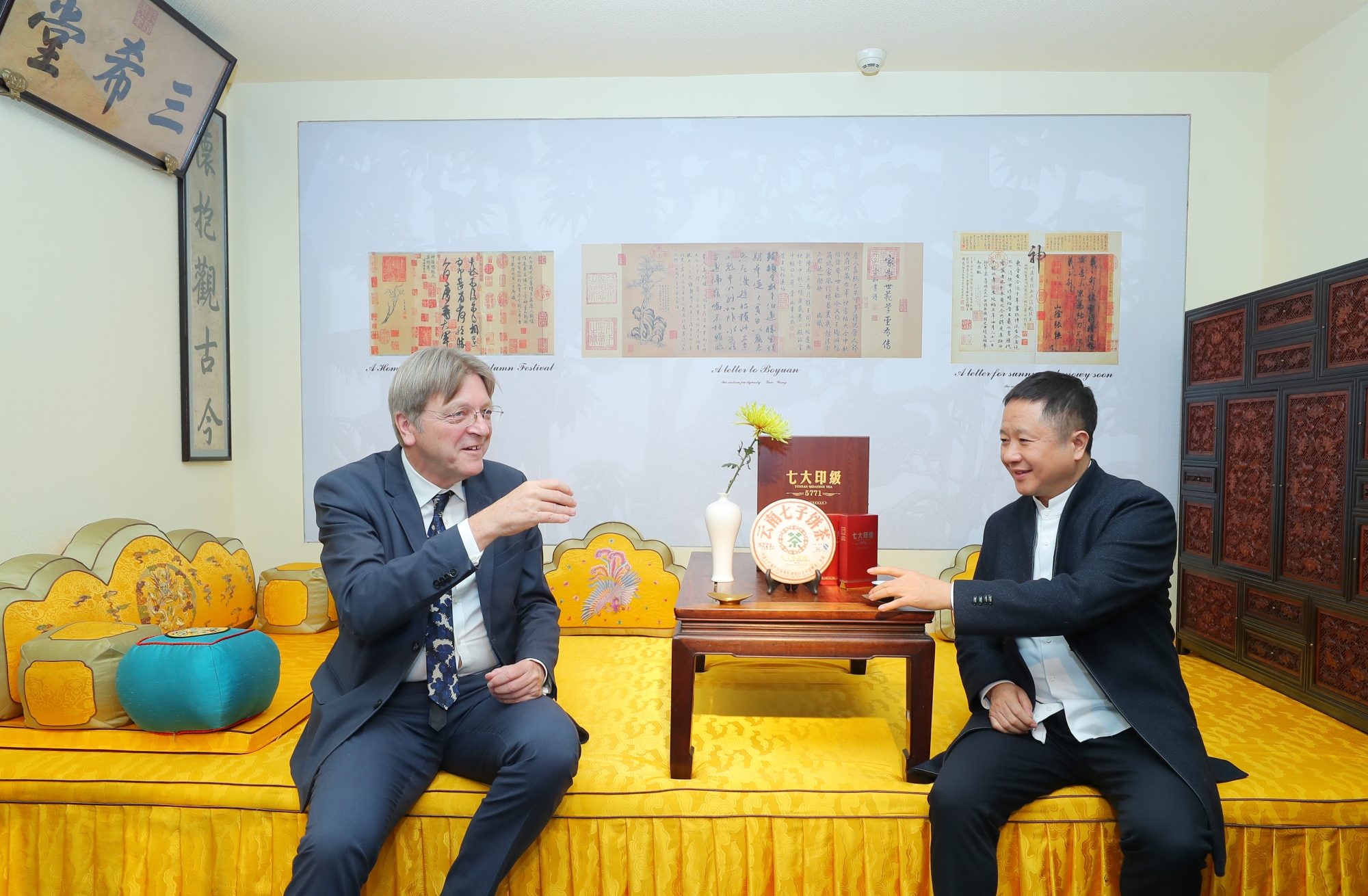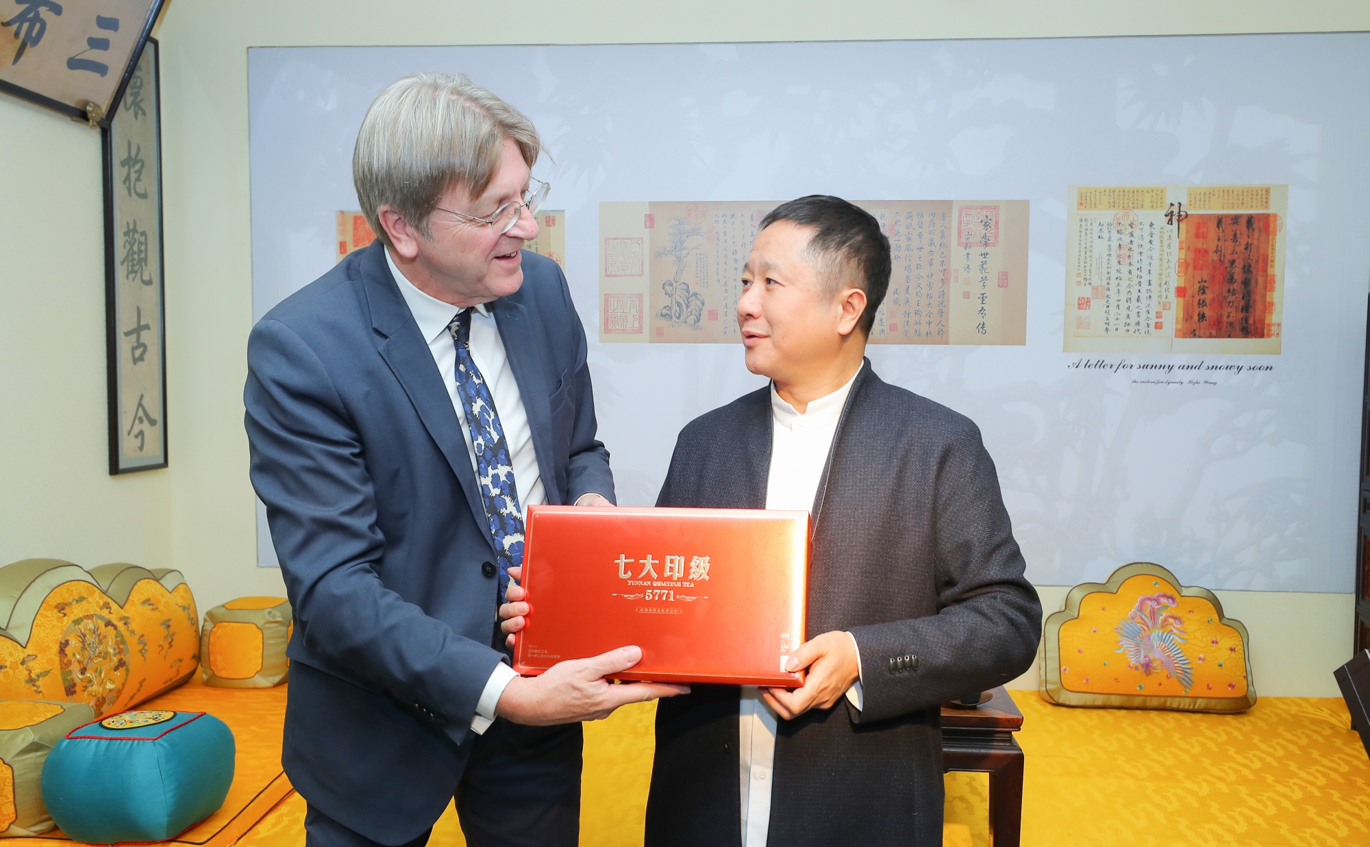 中比建交52周年之际,天月茶人以优雅茶事接待比利时前首相居伊·伏思达,共品七大印级5771普洱茶,并送上七大印级5771及天月年份茶茶礼,获得首相极高赞誉。