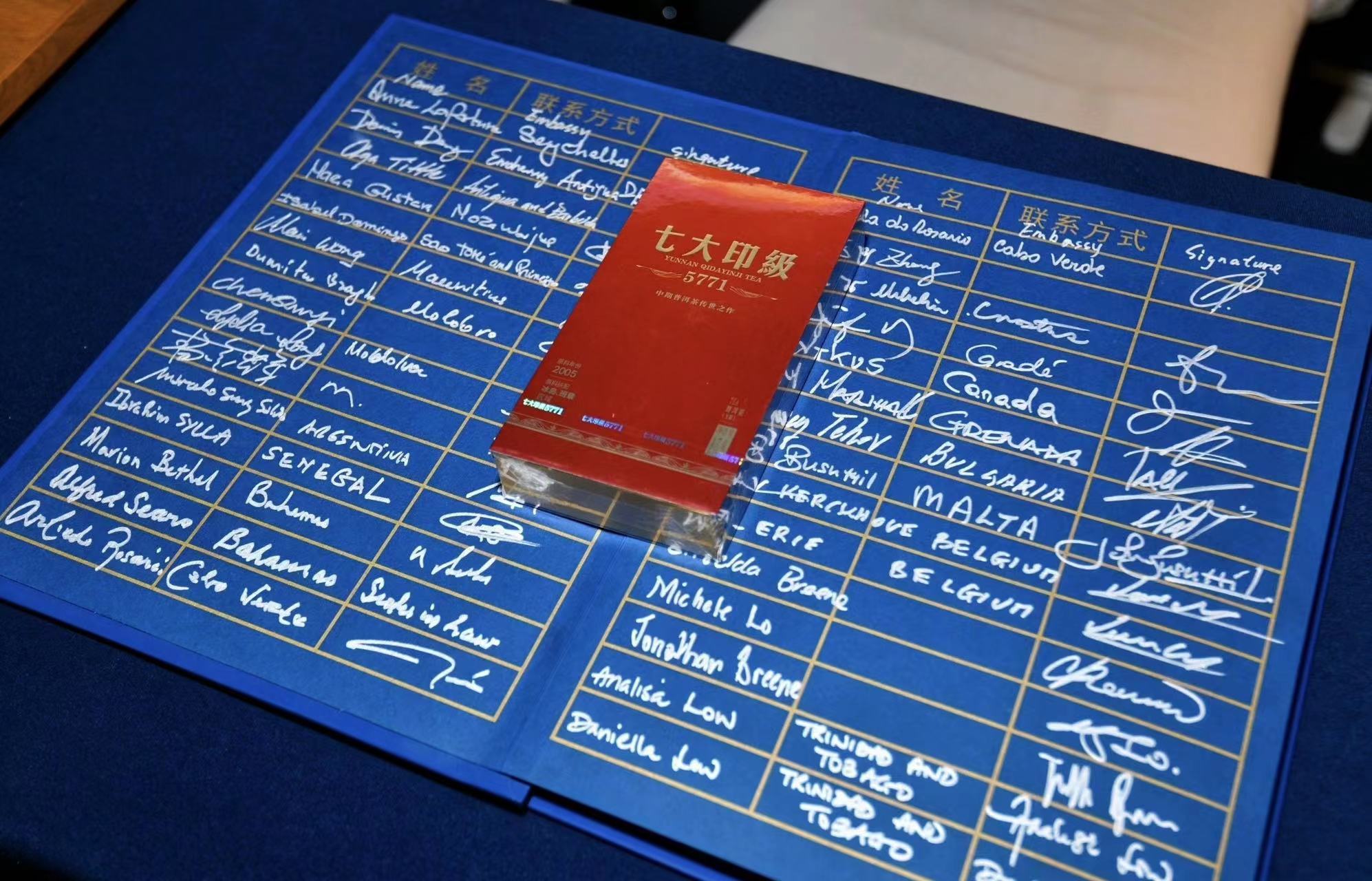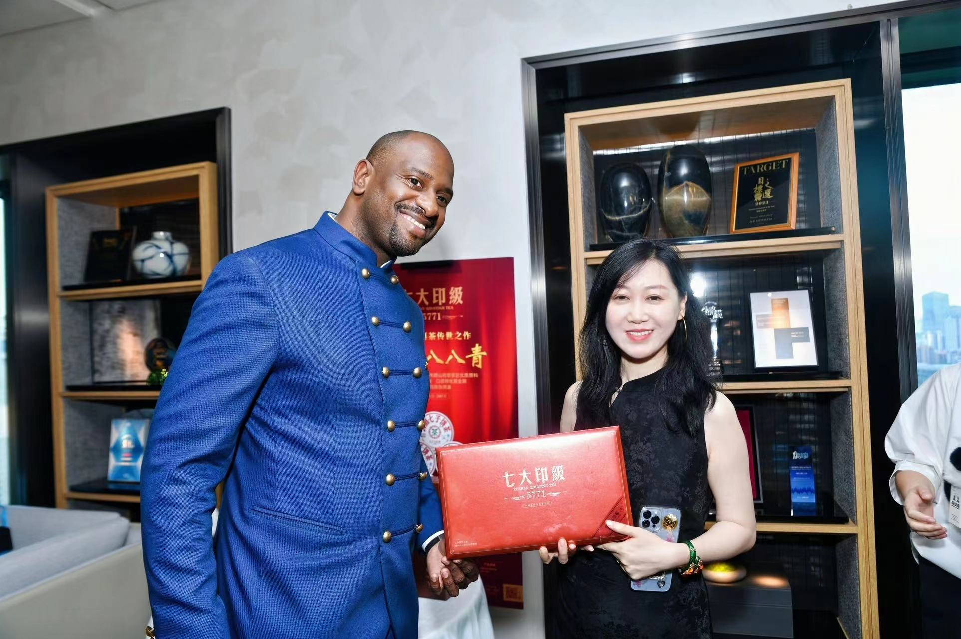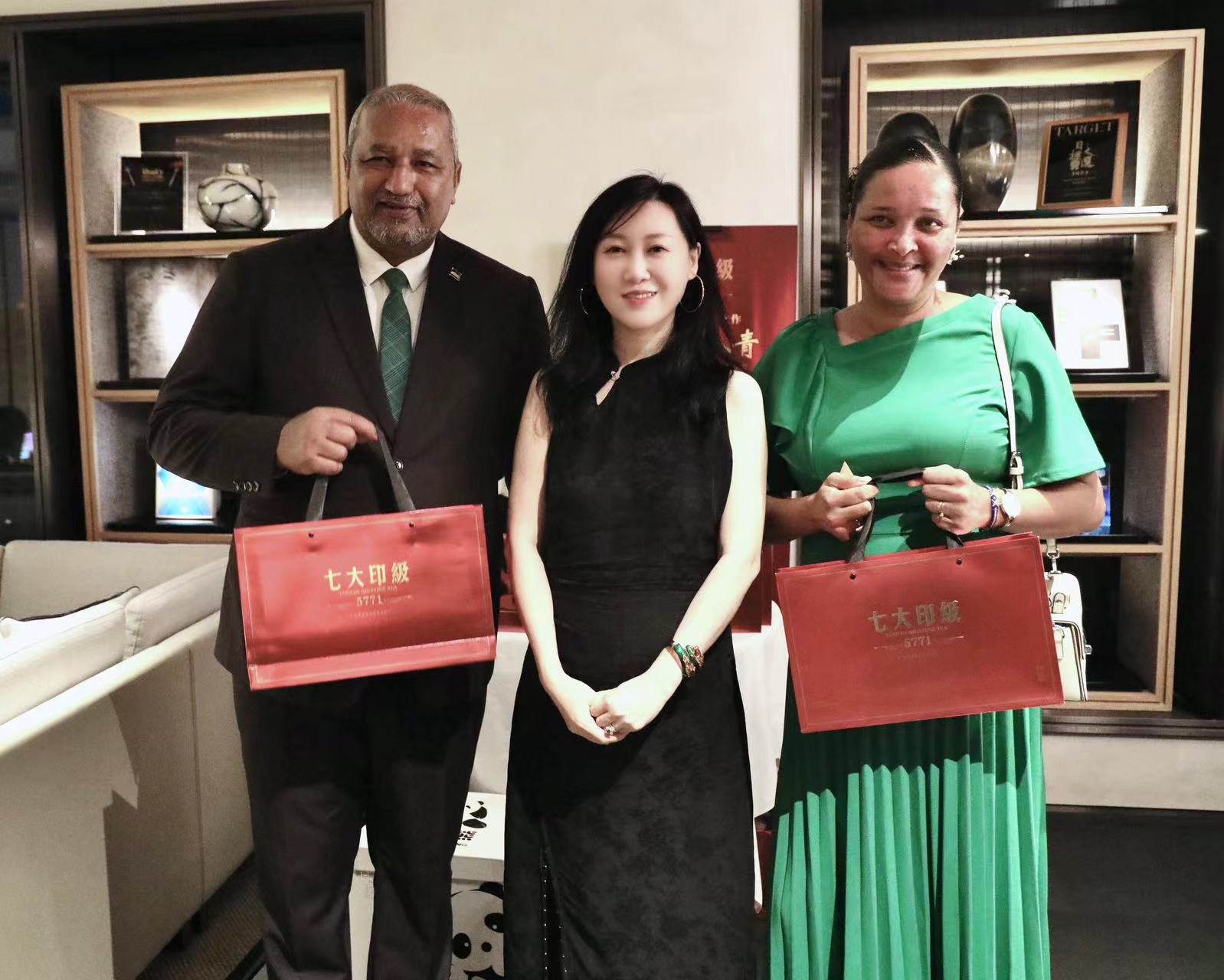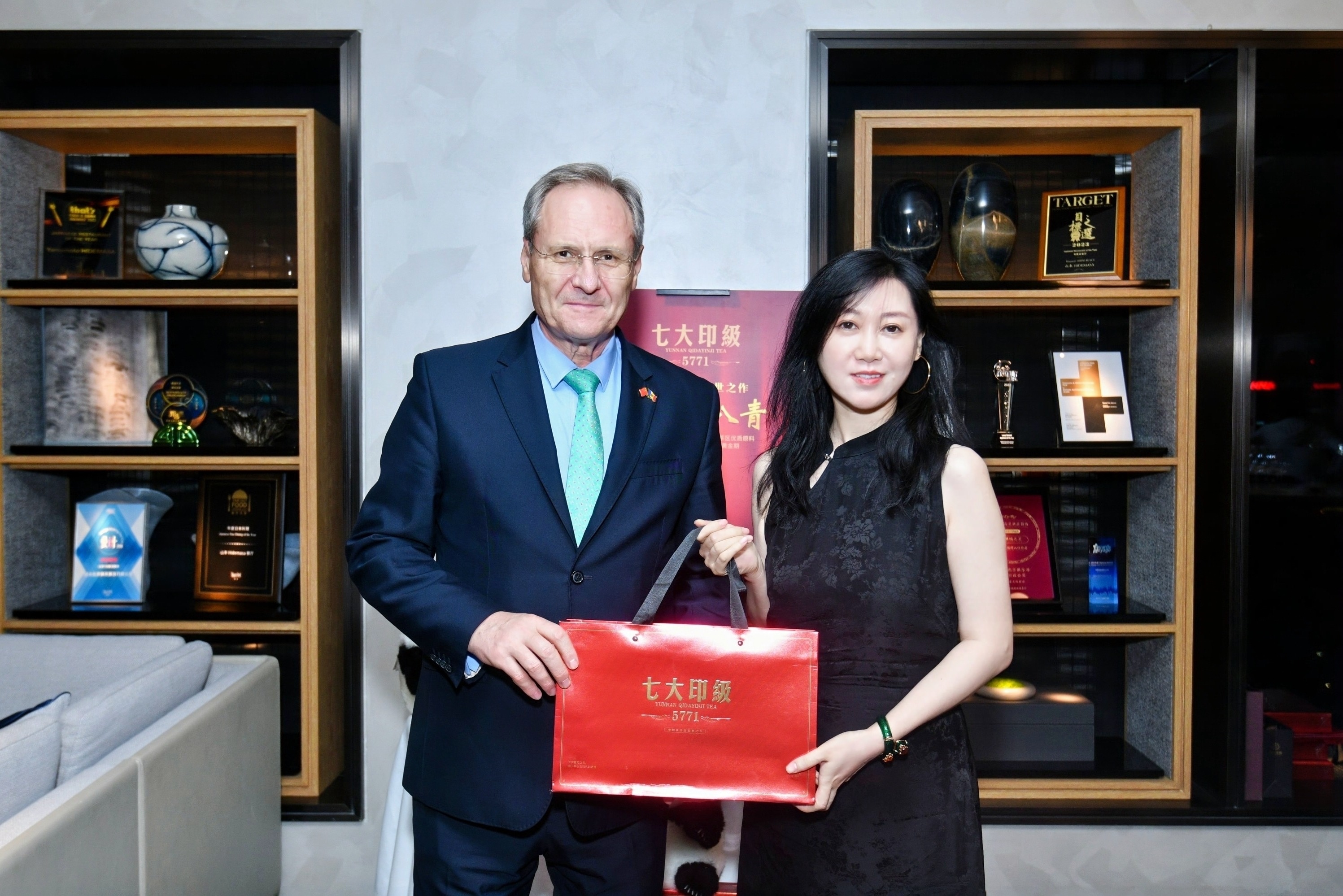 天月集团向加拿大驻华大使梅倩琳、苏里南驻华大使Pick Fung Ho-Chong 、马耳他驻华大使 白瀚轩赠送七大印级5771茶礼。
